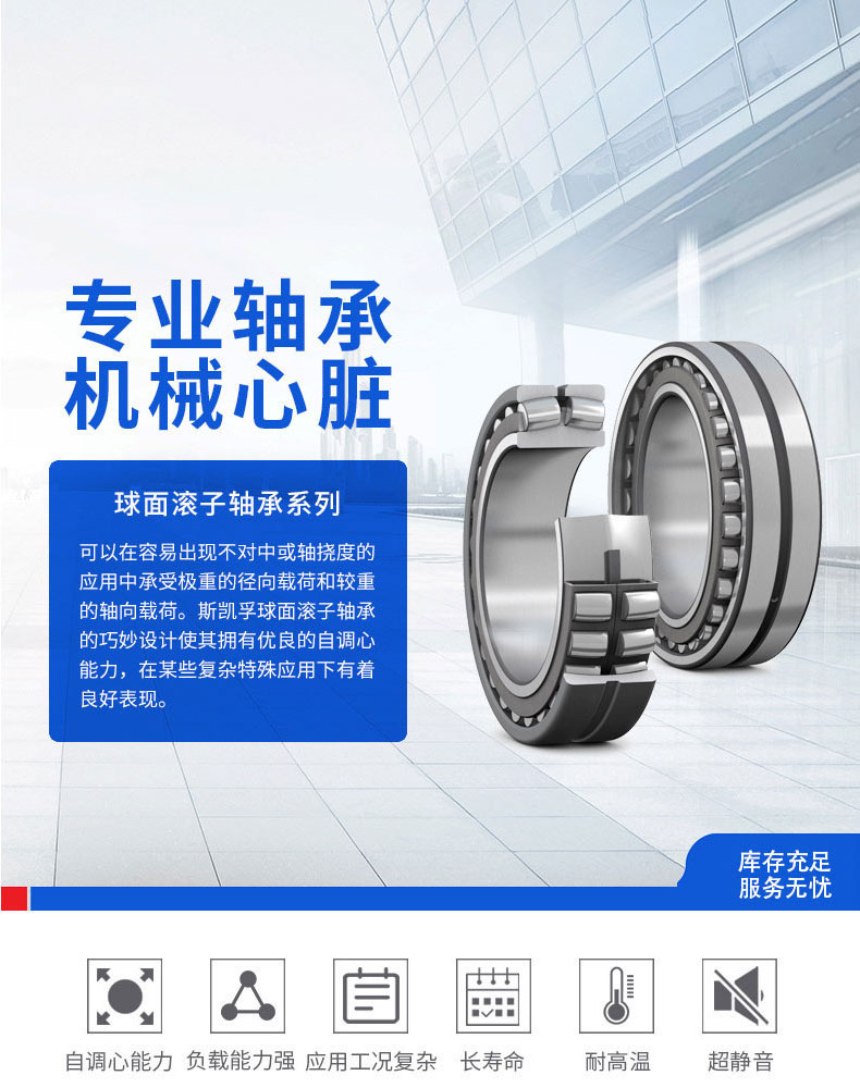 SKF球面滚子轴承的滚子的制造极为严格的公差尺寸和形式。每个辊子在集合中的其它辊的尺寸和形状几乎是相同的。优化负荷分布辊轴承的使用寿命**化。